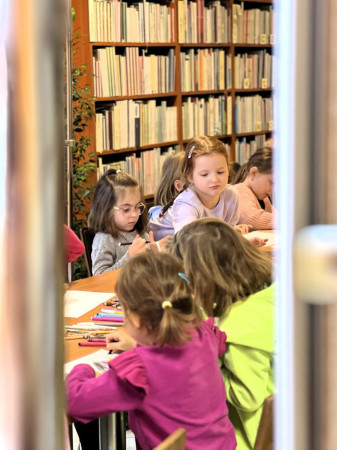 Dzieci pracują przy stole w skupieniu - widok zza galerii bibliotecznej