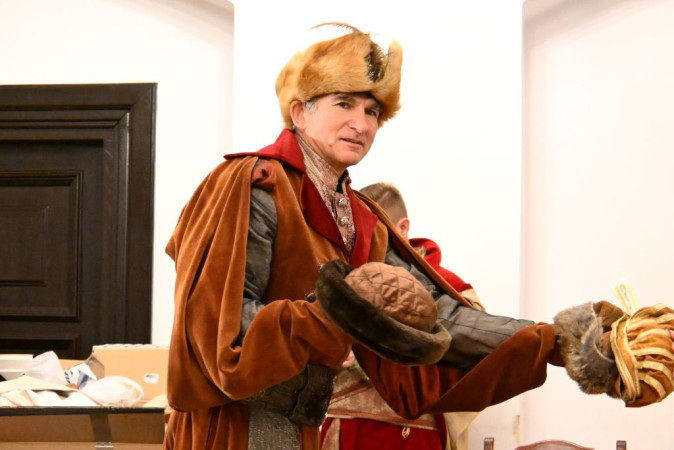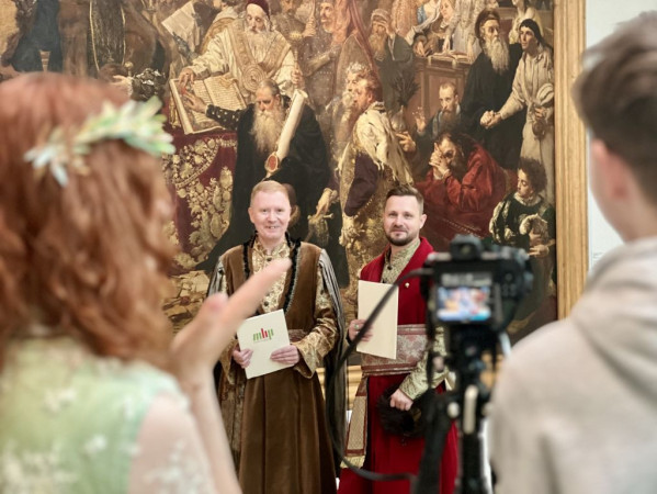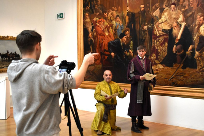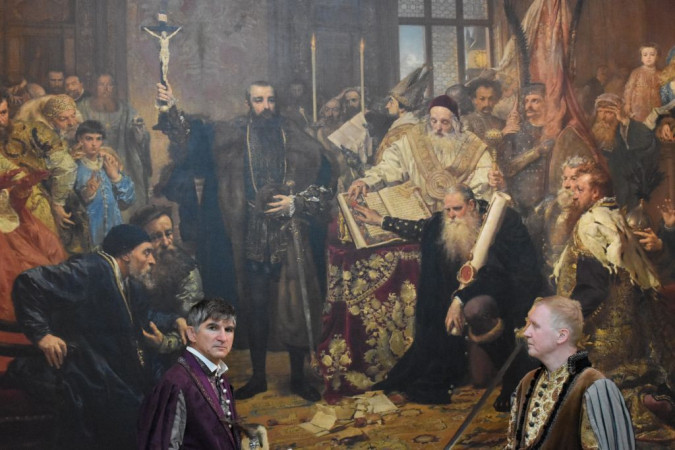 Dwóch mężczyzn w strojach historycznych na tle obrazu Matejki "Unia Lubelska"