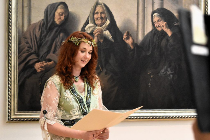 Kobieta z wieńcem laurowym na głowie czyta tekst, za nią obraz przedstawiający trzy sędziwe kobiety