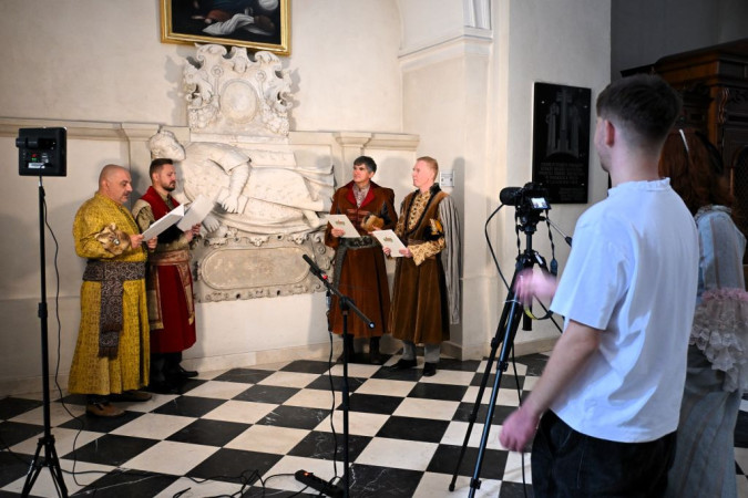 Czterech mężczyzn w szlacheckich strojach czyta swoje role, nagrywa ich mężczyzna