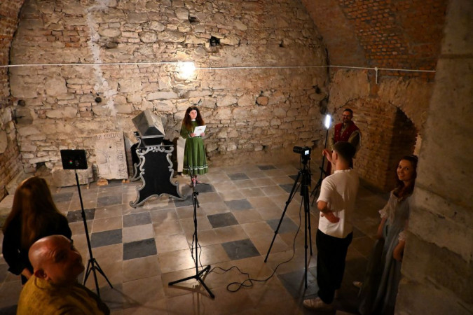 Nagrywanie sceny w kryptach, kobieta czyta tekst, stojąc przy grobie