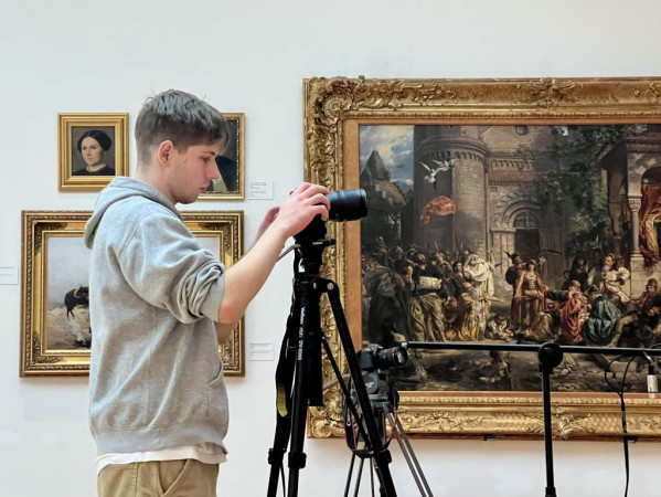 Igor Ziembowicz podczas nagrywania filmu w scenerii Muzeum Narodowego, na tle obrazów