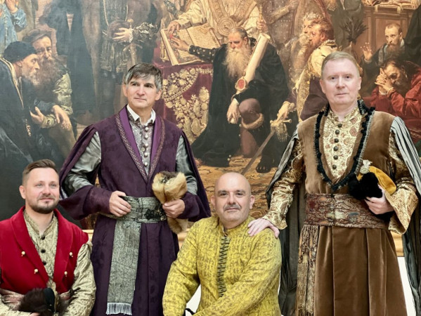 Czterej bibliotekarze w strojach szlacheckich pozują do zdjęcia na tle obrazu Matejki