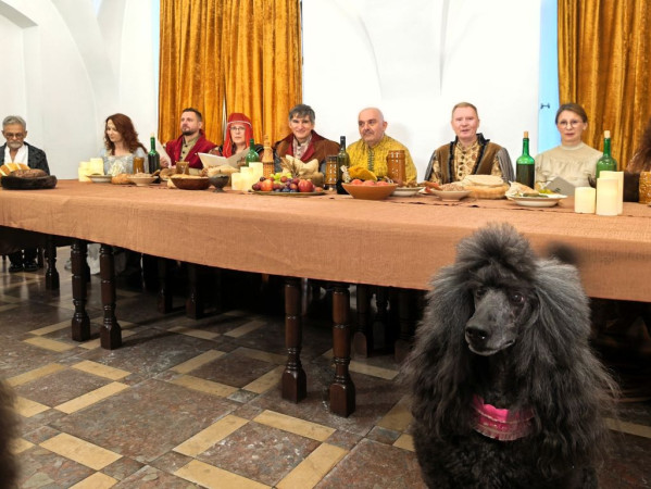 Czarny pudel królewski przechadza się wzdłuż stołu, przy którym siedzą uczestnicy biesiady