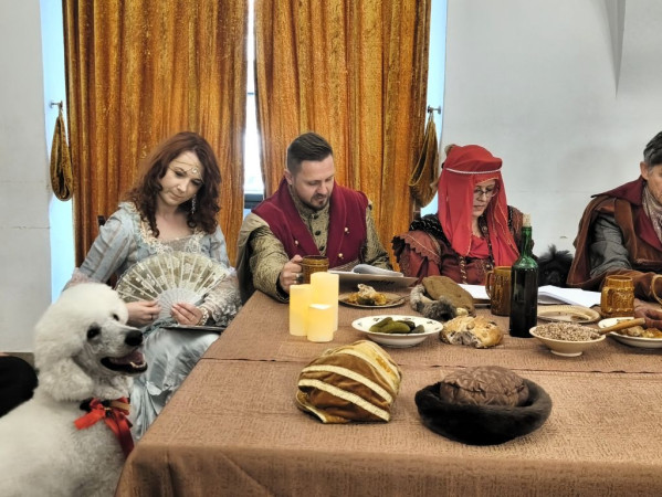 Na pierwszym planie czarny pudel królewski, w tle - inscenizacja przy scenie biesiadnym podczas Narodowego Czytania