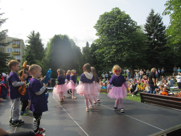 Dziewczynki w tiulowych spódniczkach tańczą na scenie, z tyłu chłopcy z imitacjami instrumentów muzycznych