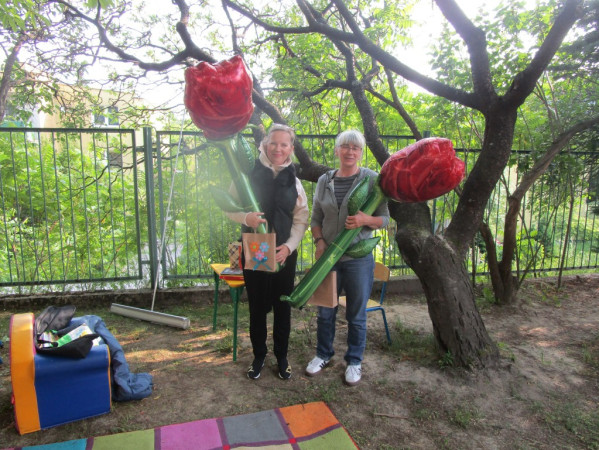 Bibliotekarki Filii nr 28 MBP trzymają w rękach wielkie balony w kształcie tulipanów