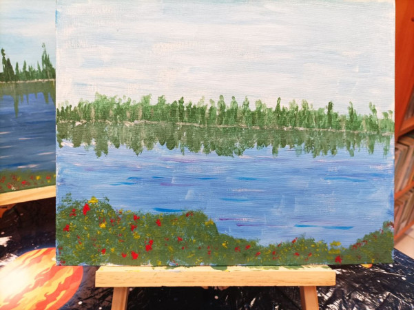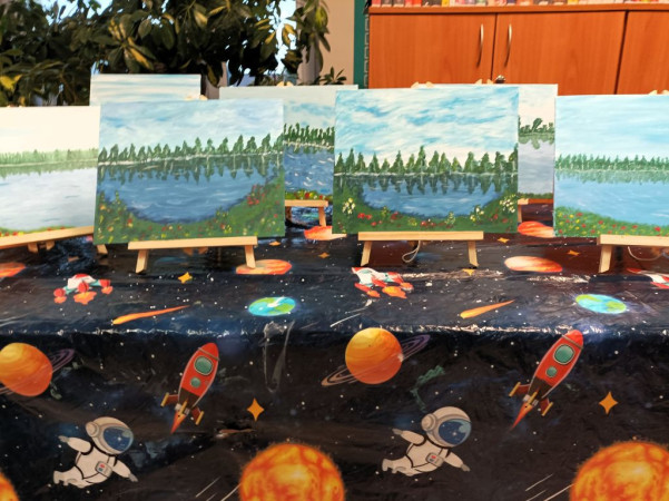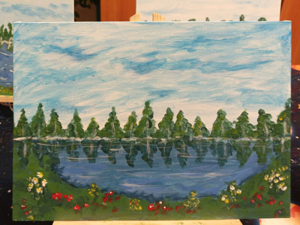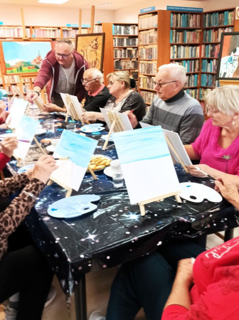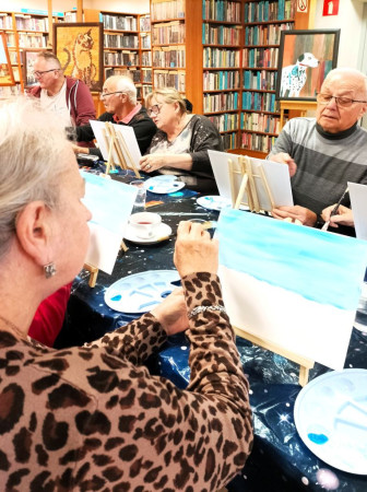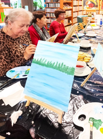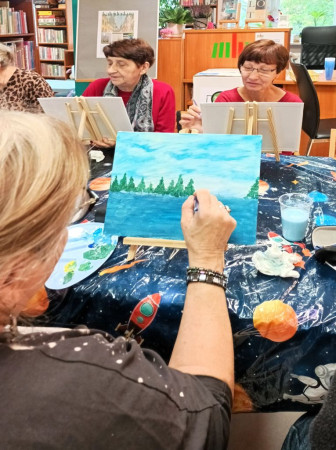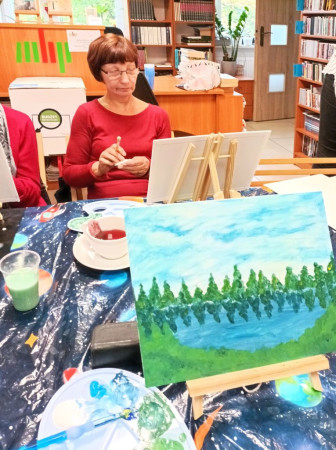 „Pejzaż zapisany w wodzie” to tytuł warsztatów artystycznych przygotowanych przez Filię nr 39 dla seniorów w czasie Weekendu Seniora z Kulturą 2025 r. Uczestnicy pod profesjonalnym kierunkiem terapeuty Anety Bieńkowskiej malowali farbami akrylowymi drzewa, które odbijają się w jeziorze. Wspólne malowanie dostarczyło uczestnikom wielu pozytywnych emocji oraz wykazanie się kreatywnością.
