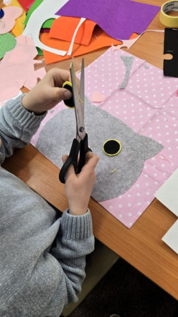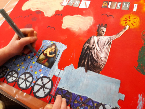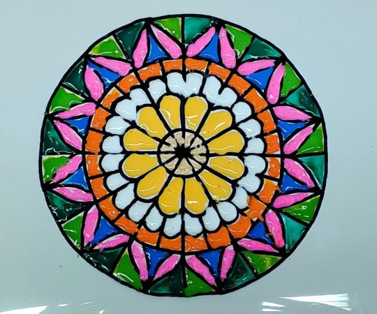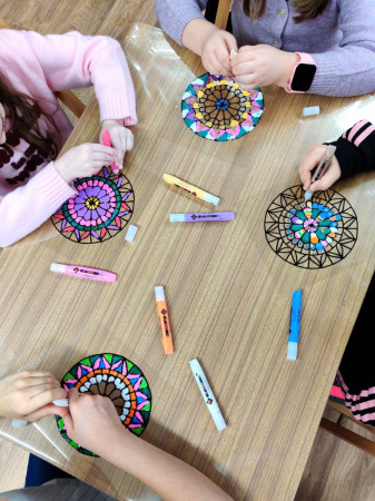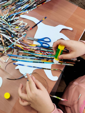 W pierwszym tygodniu, w poniedziałek, wykorzystując pocięte paski z gazet – stworzyliśmy kolaże przedstawiające kota. W środę powstały kolorowe witraże malowane farbami do szkła – inspirowane gotycką rozetą.