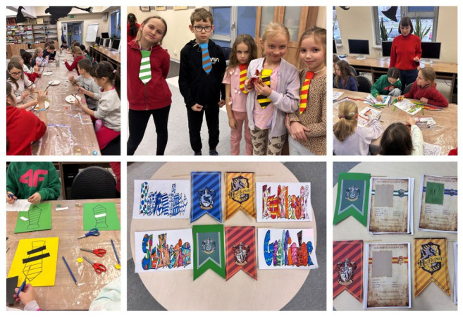 Pierwszy dzień "Fantastycznych ferii" zaczęliśmy od zapoznania się i wybrania swojego Patronusa. Następnie dzieci wykonały swoje ID, by móc wstąpić do Szkoły Magii i Czarodziejstwa i zostały przydzielone do odpowiednich domów w Hogwarcie. Każdy przygotował kolorowy napis z nazwą swojego domu. Według tego przydziału powstały kolorowe krawaty. Nie zabrakło również atrybutów każdego czarodzieja - różdżek, własnoręcznie pomalowanych i ozdobionych. Na koniec w ciemności oglądaliśmy Patronusy, czyli hologramy ze zwierzętami.