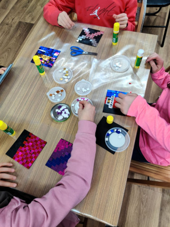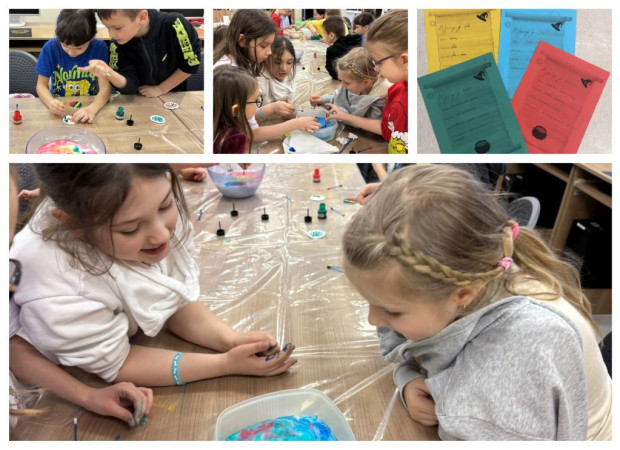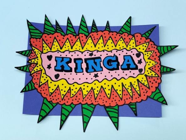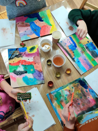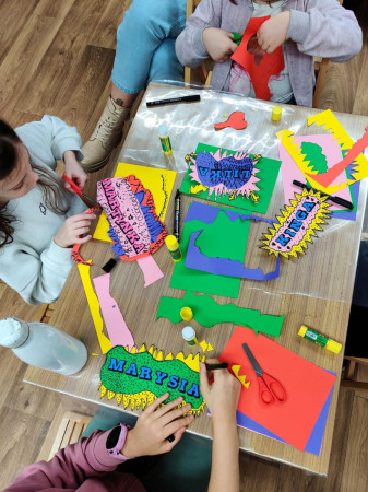 W drugim tygodniu, w poniedziałek, projektowaliśmy imiona w stylu pop art, pełne intensywnych barw i wyrazistych kontrastów. W środę powstały mozaiki z kolorowych, metalicznych kwadracików, które wymagały skupienia, precyzji i cierpliwości. Piątek poświęciliśmy abstrakcjonizmowi – za pomocą farb akwarelowych oraz stempli udało nam się stworzyć prawdziwe arcydzieła.