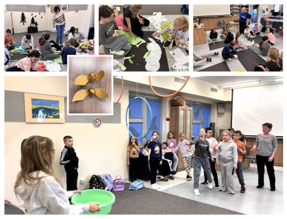Drugiego dnia dzieci pisały list z Hogwartu i ozdabiały koperty. Wstępem do gry ruchowej "Czy jestem czarodziejem?" była prezentacja na temat bohaterów z uniwersum Harrego Pottera. W czasie gry wykorzystaliśmy Karty z Czekoladowych Żab. Na koniec każdy wykonał swojego feniksa. W międzyczasie dzieci pozowały do czarodziejskich zdjęć.