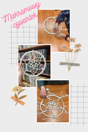 W bibliotece odbywają się stałe bezpłatne zajęcia z makramy, które cieszą się coraz większą popularnością. Podczas warsztatów uczestnicy mają okazję nauczyć się różnych technik wyplatania i tworzenia ozdób z makramy, co stanowi doskonałą formę relaksu i kreatywnej aktywności. Aktualnie podczas spotkań tworzymy łapacze snów. Zajęcia są doskonałą okazją do rozwijania umiejętności manualnych oraz spotkania z pasjonatami rękodzieła.