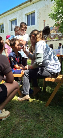 Jedną z największych atrakcji było malowanie twarzy – z powodu dużego zainteresowania na efekt trzeba było nieco poczekać, ale dzieci cierpliwie stały w kolejce. Dużą popularnością cieszyły się również brokatowe tatuaże. Wybór był imponujący: od małych, delikatnych gwiazdek, po większe, kolorowe motywy. Dzieciaki wybierały swoje ulubione wzory, a później z dumą prezentowały je na rękach i nogach. Animatorka prowadziła szereg dynamicznych gier i zabaw angażujących dzieci w różnym wieku, z niezwykłą energią potrafiła świetnie nawiązać kontakt z dziećmi, które chętnie uczestniczyły we wszystkich aktywnościach, śmiejąc się i rywalizując w przyjaznej atmosferze. Dla wszystkich preferujących spokojniejsze zajęcia przygotowano kącik czytelniczy, gdzie dzieci mogły w ciszy i spokoju przeglądać książki. Był też wybór gier planszowych – zarówno dla młodszych, jak i dla starszych dzieci. Przygotowany został również kącik labiryntów i kolorowanek. Nie można pominąć warsztatów robienia przypinek. Dzieci z pomocą bibliotekarza tworzyły własne, unikatowe przypinki, które chętnie nosiły przez całą imprezę. Zaprzyjaźniony żłobek „Mali Odkrywcy” włączył się do zabawy i przygotował balonowe upominki. Dzień Dziecka z biblioteką to był strzał w dziesiątkę!