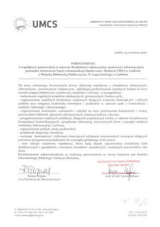 Podpisanie Porozumienia pomiędzy Miejską Biblioteką Publiczną im. Hieronima Łopacińskiego w Lublinie a Instytutem Nauk o Komunikacji Społecznej i Mediach Uniwersytetu Marii Curie-Skłodowskiej w Lublinie.