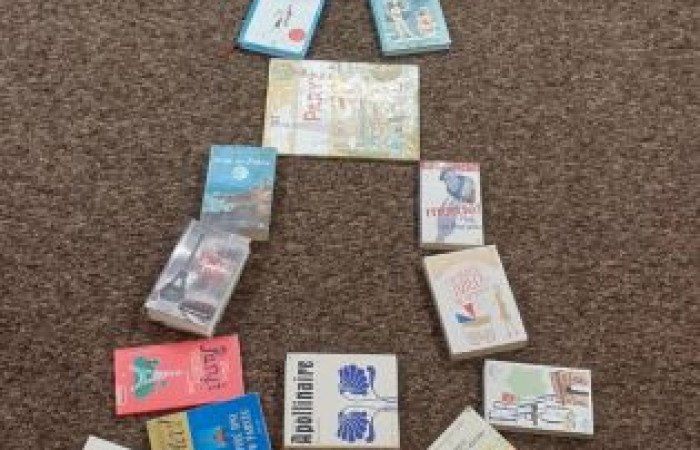 ksiażki o tematyce francuskiej ułożone na dywanie