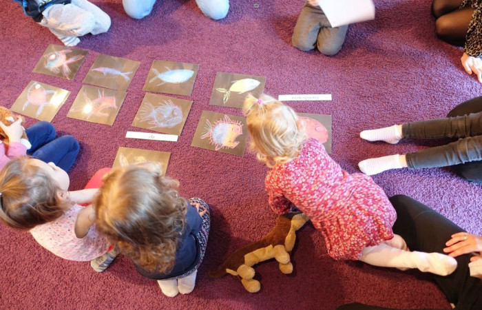 Na filoetowym dywanie dziewczynka układa obrazki z narysowanymi rybami
