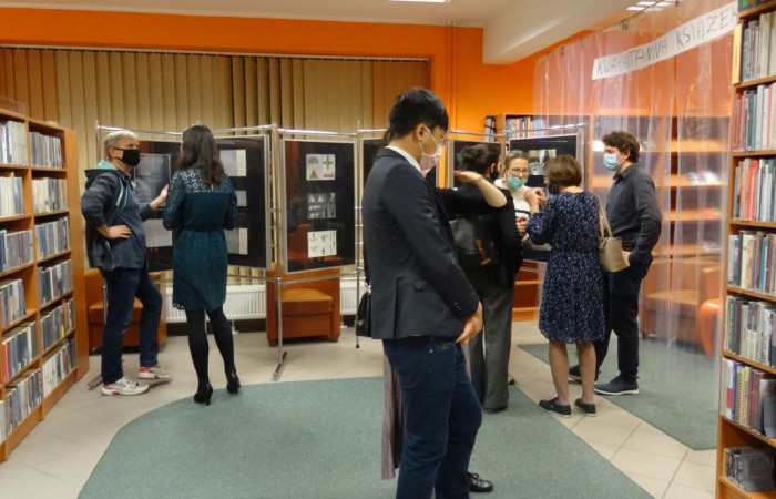 W przestrzeni biblioteki osoby przybyłe na wernisaż stoją i rozmawiają