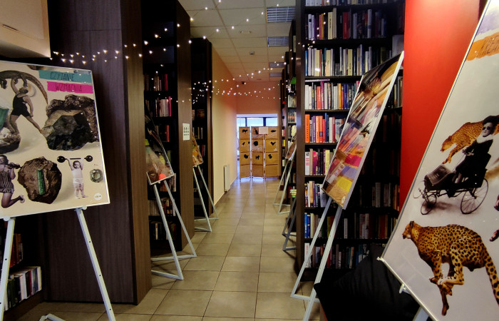 korytarz z regałami i książkami, pomiędzy nimi ustawione sztalugi z kolażami w dużym formacie