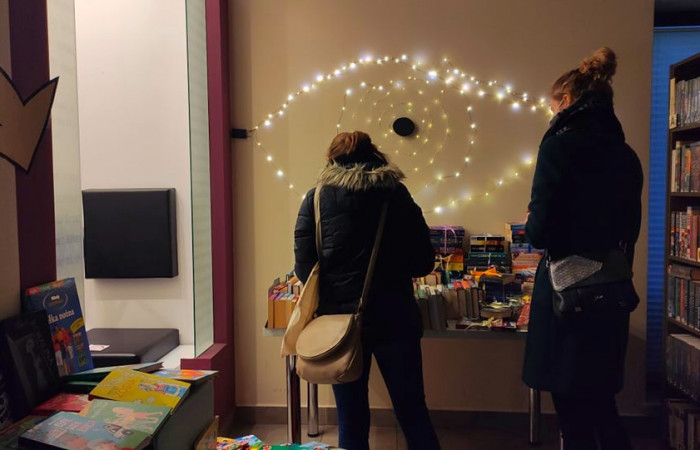 Dwie osoby stojące tyłem do obiektywu przeglądają książki wyłożone na stoliku