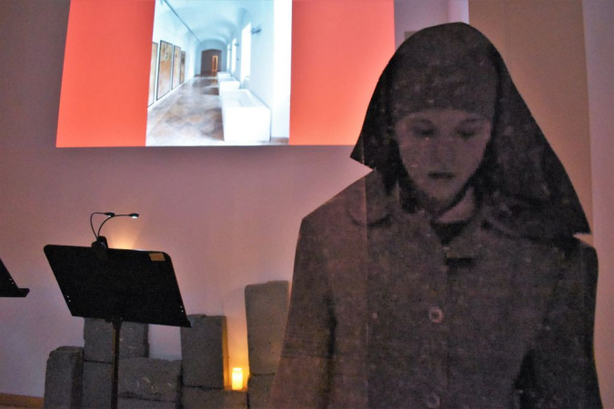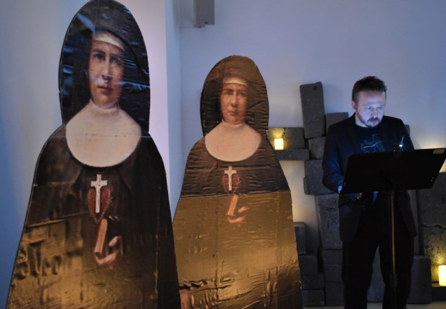 Czytanie performatywne, wśród przygotowanej scenografii widać świece, imitację murów klasztornych i makiety zakonnic