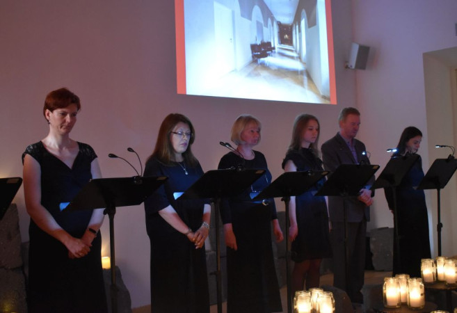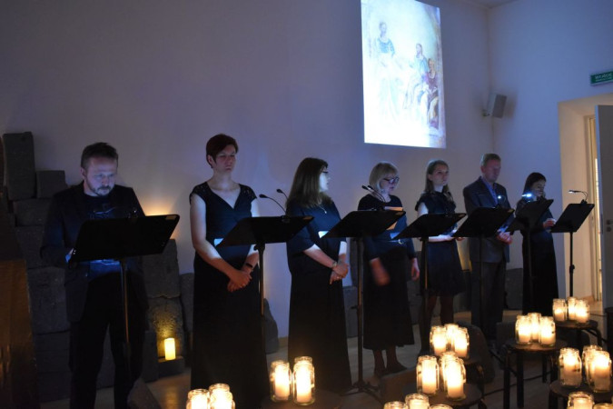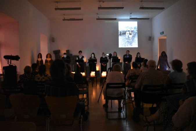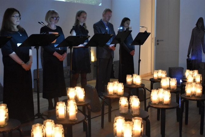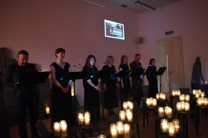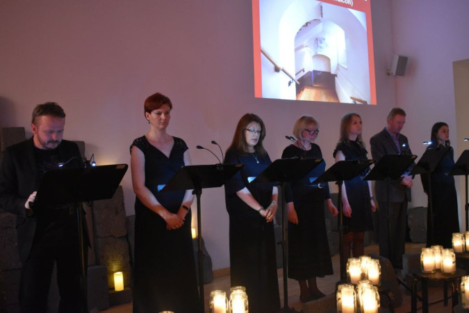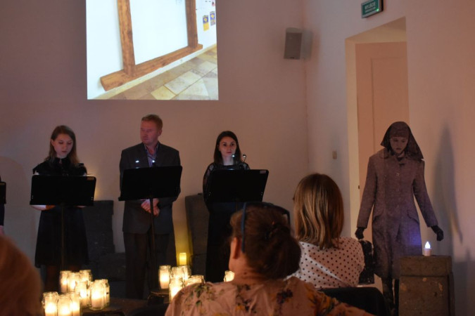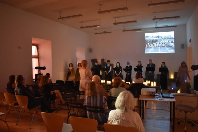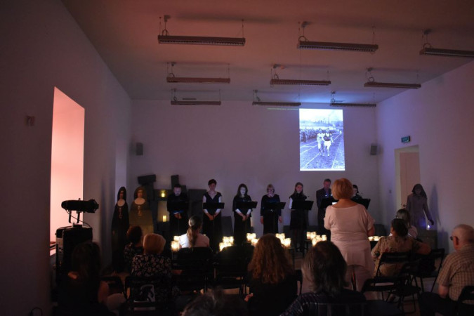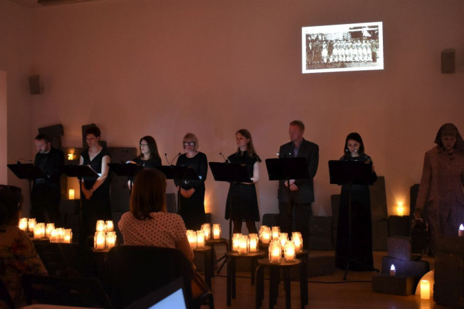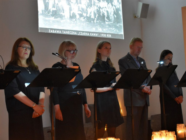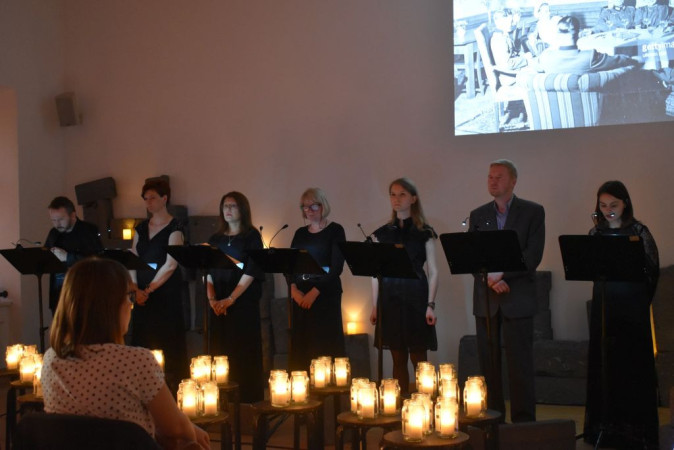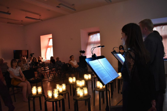 Migoczące świece, w tle uczestnicy czytania i makieta z filmu 'Ida'