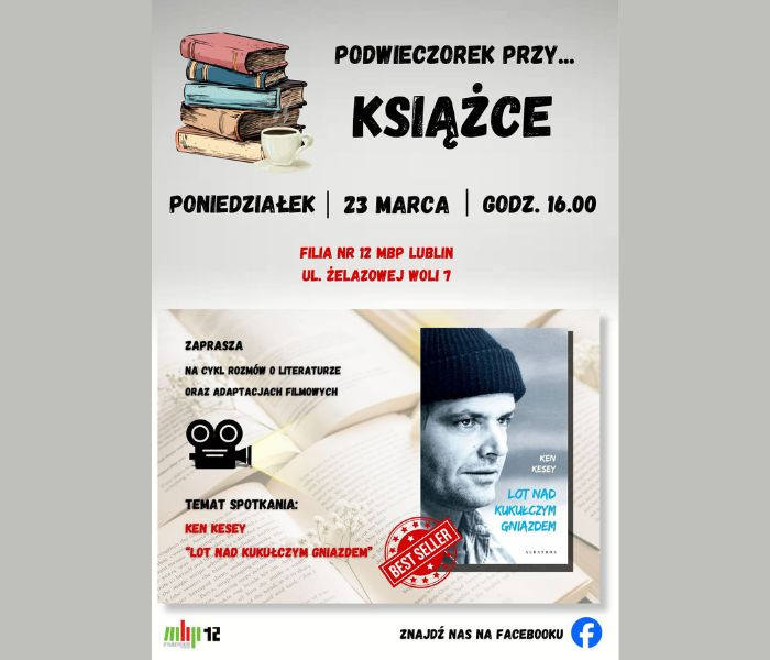 Filia nr 12 MBP Lublin (ul. Żelazowej Woli 7) zaprasza wszystkich miłośników literatury na kolejne spotkanie z cyklu „Podwieczorek przy...KSIĄŻCE", podczas którego - przy kawie i słodkim poczęstunku - uczestnicy rozmawiają o książkach oraz ich adaptacjach filmowych.