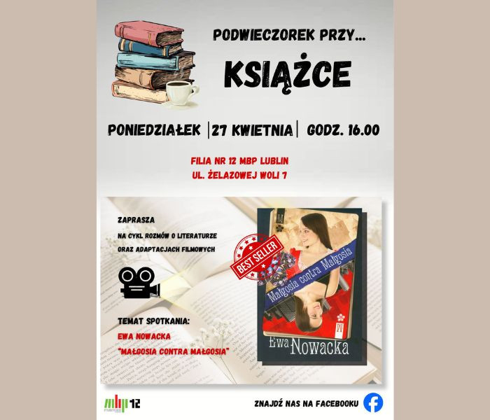 Filia nr 12 MBP Lublin (ul. Żelazowej Woli 7) zaprasza wszystkich miłośników literatury na kolejne spotkanie z cyklu „Podwieczorek przy...KSIĄŻCE", podczas którego - przy kawie i słodkim poczęstunku - uczestnicy rozmawiają o książkach oraz ich adaptacjach filmowych.