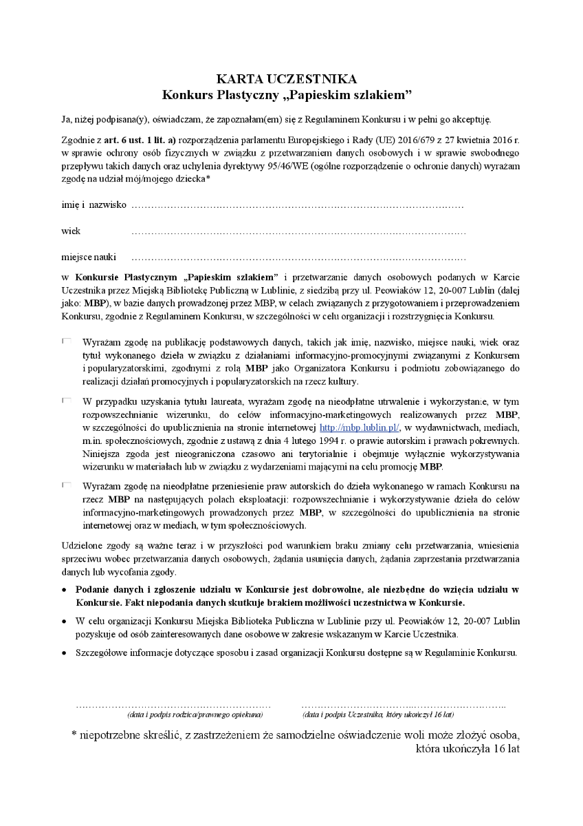 Do zgłaszanych prac należy dołączyć wypełnioną kartę uczestnika.