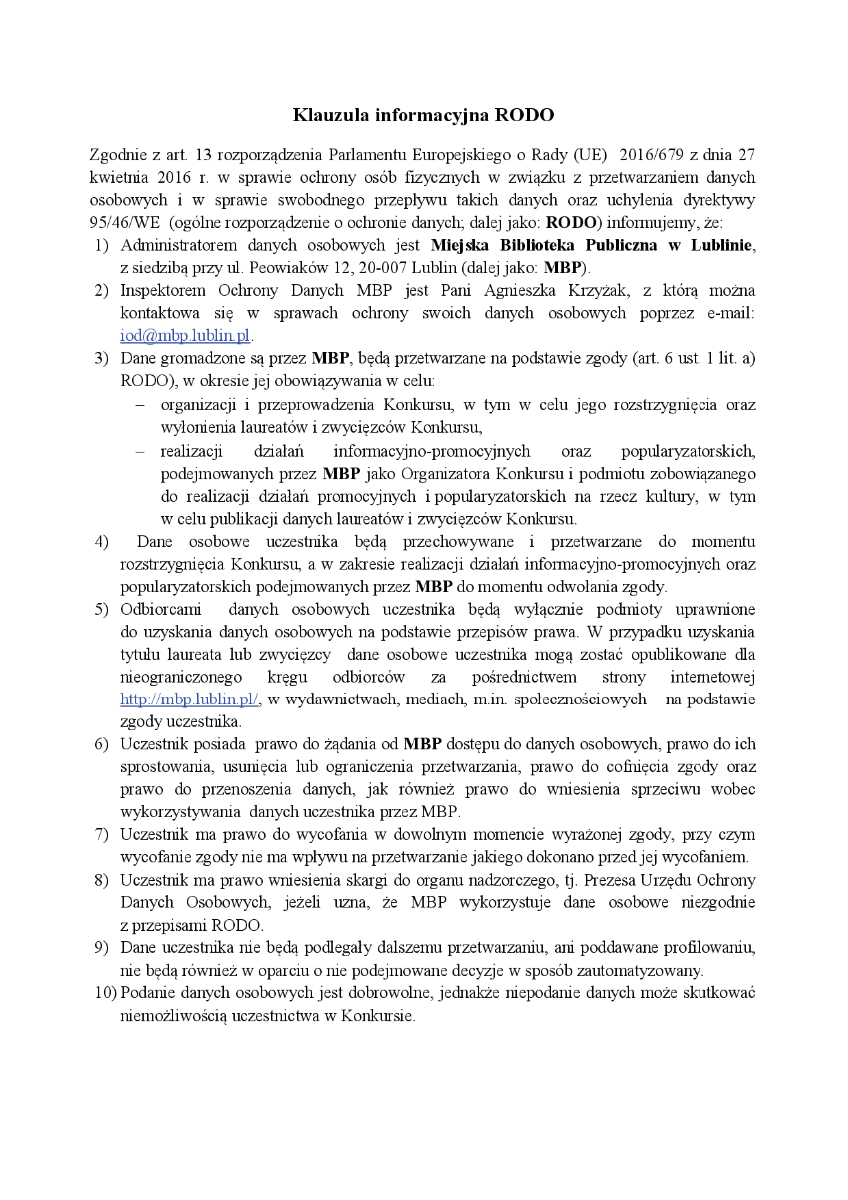 3. Do pracy konkursowej należy dołączyć następujące dane: imię i nazwisko, wiek uczestnika oraz nazwa szkoły i nazwisko nauczyciela wraz z numerem telefonu i adresem mailowym.