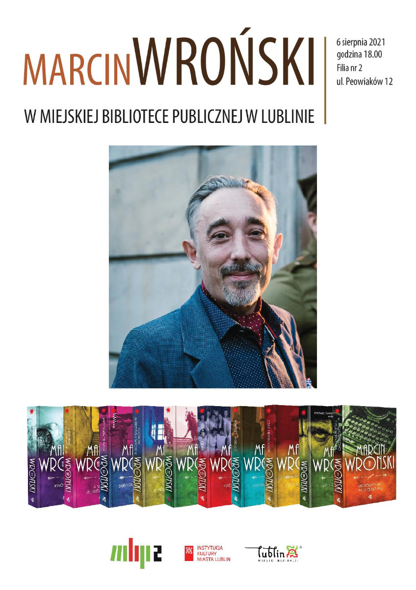 Marcin Wroński - pisarz, najbardziej znany z popularnego cyklu kryminałów retro o komisarzu Zygmuncie Maciejewskim. Urodził się w Lublinie, ukończył polonistykę na KUL. Debiutował w 1992 roku zbiorem opowiadań "Udo Pani Nocy", wkrótce wydał też mikropowieść pijacko-przygodową "Obsesyjny motyw babiego lata" (1994). Tworzył piosenki i skecze dla prowadzonego przez siebie kabaretu "Osoby o Nieustalonej Tożsamości", był felietonistą radiowym i prowadził audycję literacką "Fikcja o północy". Był nauczycielem języka polskiego, później kilka lat pracował jako redaktor w różnych wydawnictwach. W 2017 r. ukazało się pierwsze wydanie "Morderstwa pod cenzurą", powieści rozpoczynającej cykl kryminałów retro o komisarzu Maciejewskim, dzięki któremu Wroński, dotąd przeplatający aktywność literacką ze zleceniami redaktorskimi, został zawodowym pisarzem.