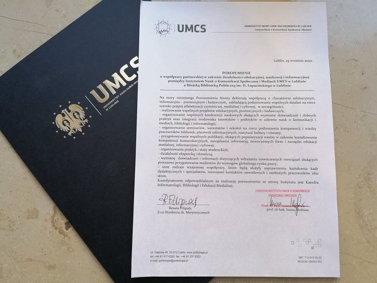 Podpisanie Porozumienia pomiędzy Miejską Biblioteką Publiczną im. Hieronima Łopacińskiego w Lublinie a Instytutem Nauk o Komunikacji Społecznej i Mediach Uniwersytetu Marii Curie-Skłodowskiej w Lublinie.