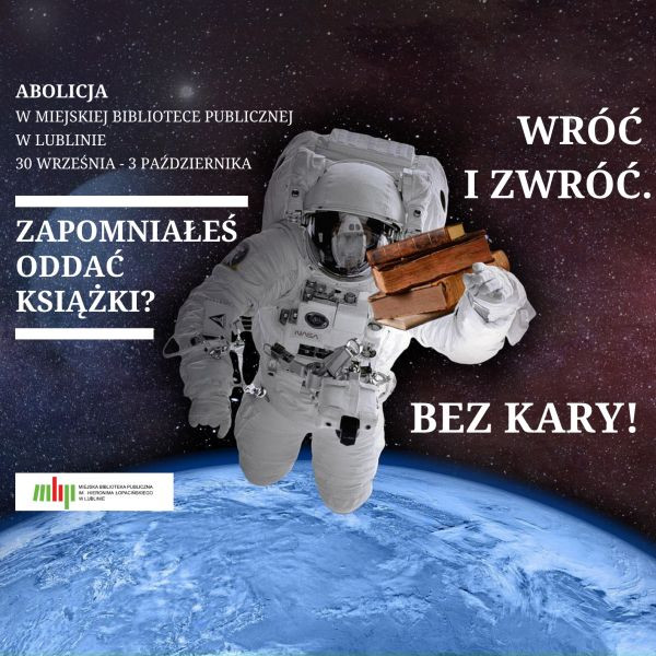 Zapraszamy serdecznie do skorzystania z abolicji w Miejskiej Bibliotece Publicznej w Lublinie. Wszyscy czytelnicy, którzy między 30 września a 3 października zdecydują się oddać przetrzymane książki wypożyczone w filiach MBP Lublin, w tym okresie mogą to zrobić bez konieczności płacenia kary finansowej.