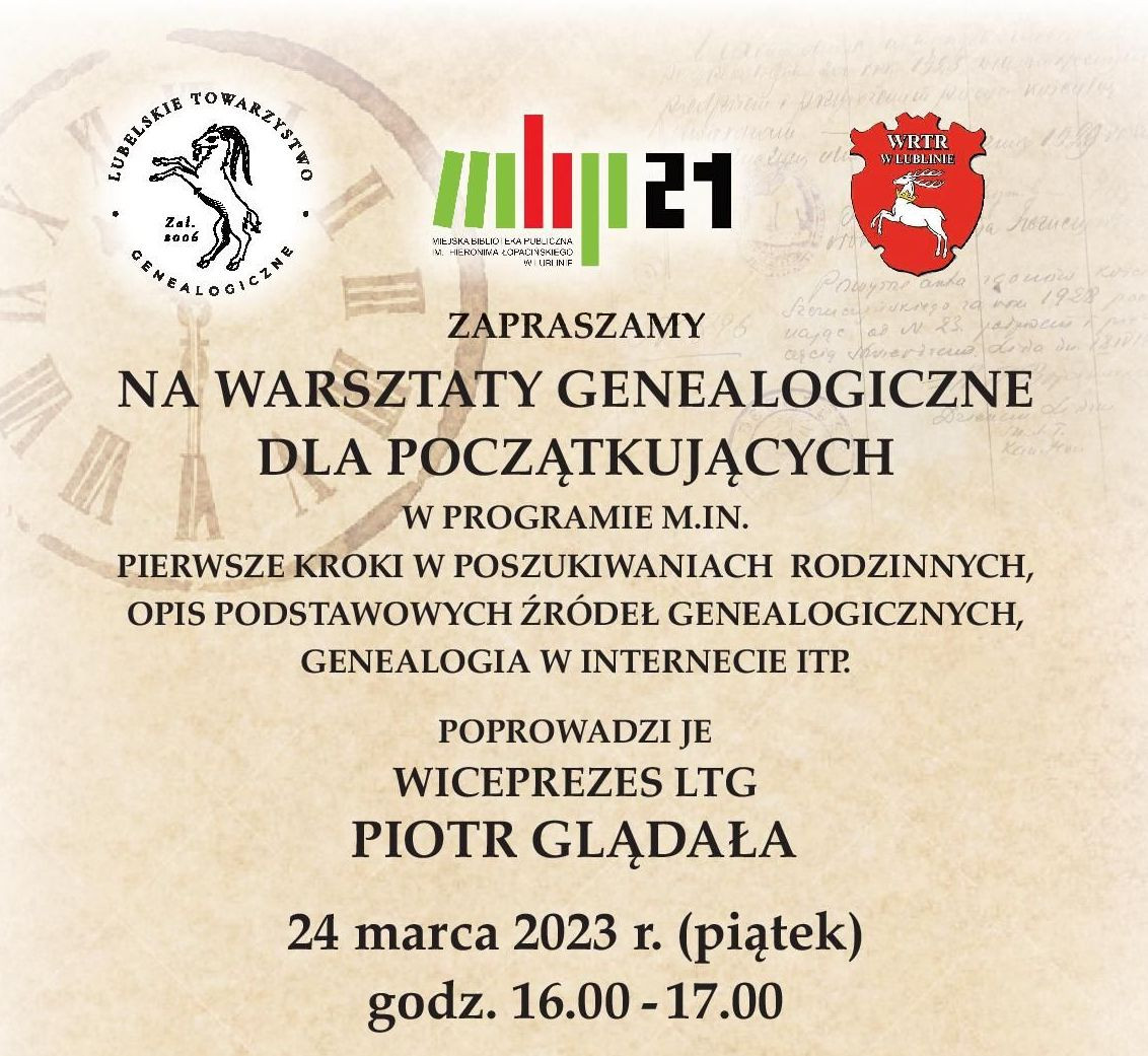 Zarząd Lubelskiego Towarzystwa Genealogicznego oraz Filia nr 21 Miejskiej Biblioteki Publicznej w Lublinie, zapraszają na warsztaty genealogiczne dla początkujących. Prowadzi je wiceprezez LTG Piotr Glądała.