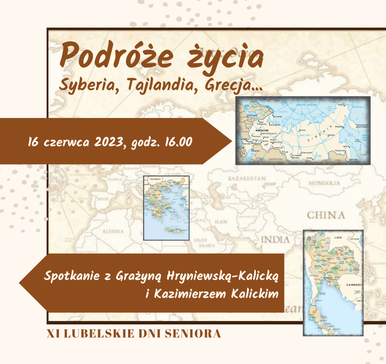 W ramach XI Lubelskich Dni Seniora Filia nr 21 Miejskiej Biblioteki Publicznej w Lublinie zaprasza na spotkanie z Grażyną Hryniewską-Kalicką i Kazimierzem Kalickim pt. "Podróże życia. Syberia, Tajlandia, Grecja...". Znana Lubelska dziennikarka wraz z mężem, z zawodu lekarzem, będą opowiadać o swoich niezwykłych przygodach podczas dalekich wypraw.
