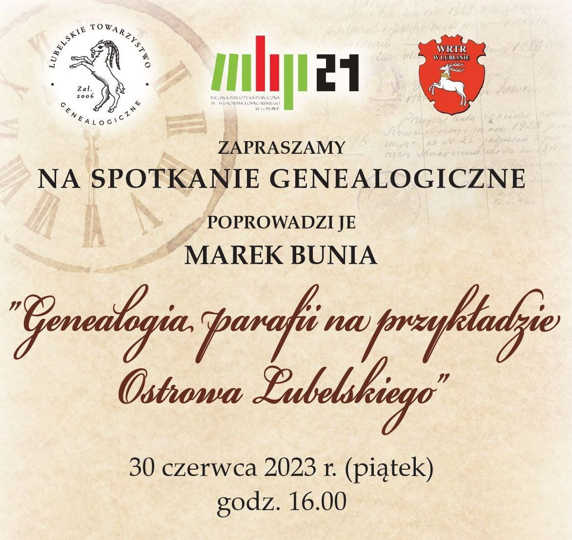 Lubelskie Towarzystwo Genealogiczne i Filia nr 21 MBP zapraszają na spotkanie pt. "Genealogia parafii na przykładzie Ostrowa Lubelskiego".