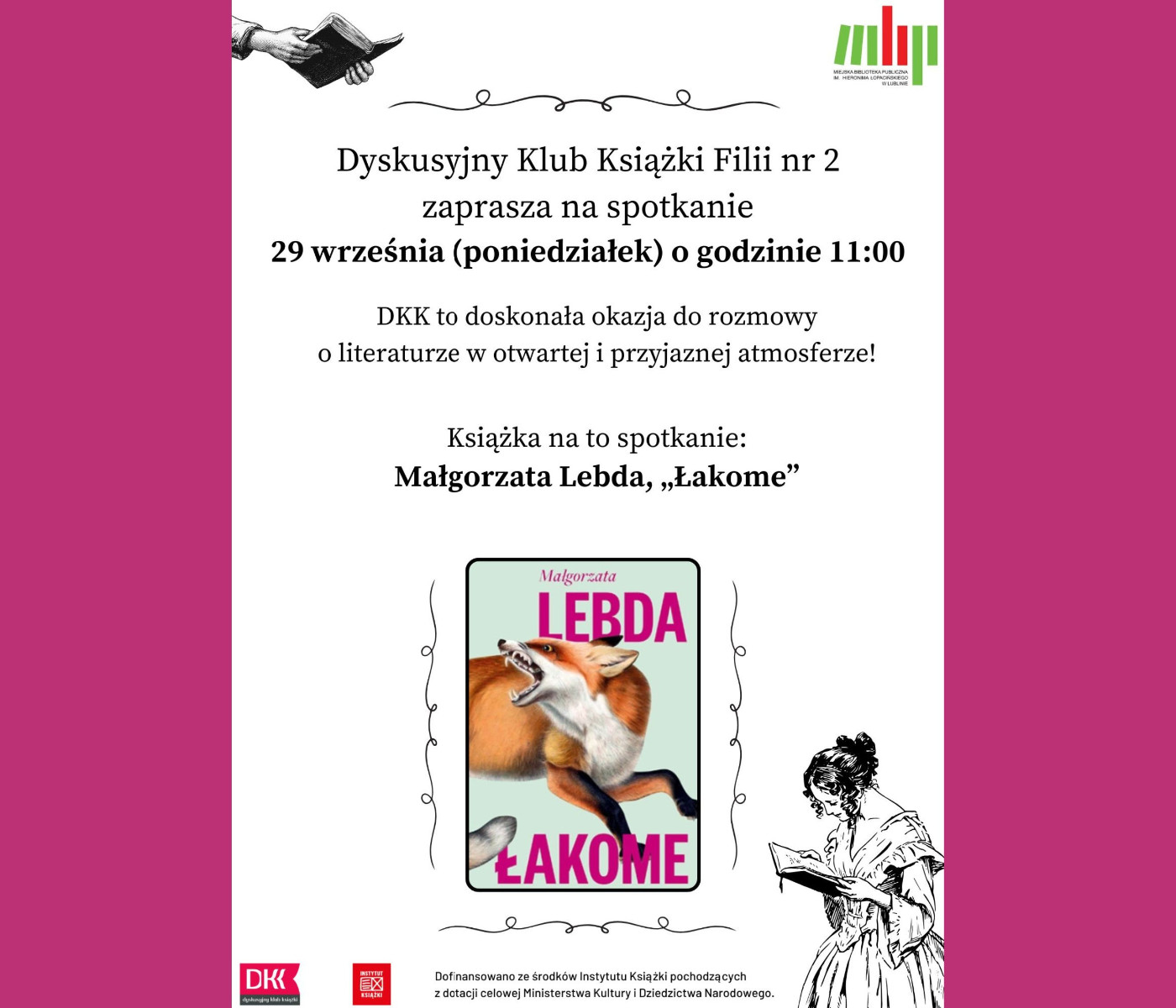 Dyskusyjny Klub Książki Filii nr 2 (ul. Peowiaków 12) zaprasza na spotkanie 29 września (poniedziałek) 2024 roku o godzinie 11.00. Porozmawiamy o książce "Łakome" Małgorzaty Lebdy.