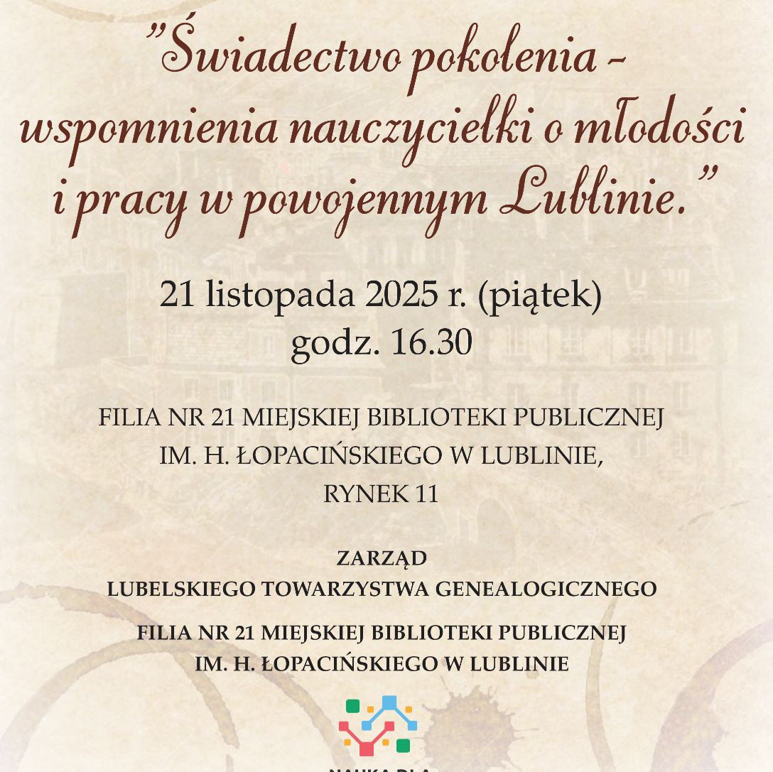 Filia nr 21 MBP i Lubelskie Towarzystwo Genealogiczne zapraszają na spotkanie z Marianną Zając pt. "Świadectwo pokolenia - wspomnienia nauczycielki o młodości i pracy w powojennym Lublinie".