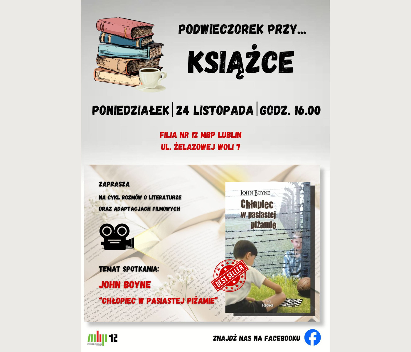 Najbliższe spotkanie odbędzie się 24 listopada 2025 r. (poniedziałek) o godz. 16.00, a tematem będzie „Chłopiec w pasiastej piżamie” Johna Boyne'a.